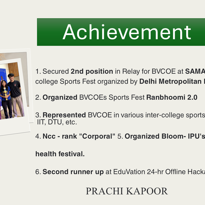 | 76 | 03011502821 | Deepanshu Kr. Rai | Avinya | Enactus BVCOE | 15-16 Apr’24 | Certificate of Appreciation | 6 |